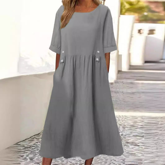Abito da Donna di Media Lunghezza con Girocollo Mezza Manica Bottoni Gonna a Linea A e Vita Ampia Autunnale