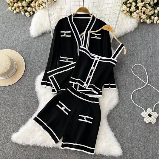 Donna Primavera Set Tre Pezzi Maglieria con Cardigan V-Neck Contrasto, Top e Gonna Abbinati