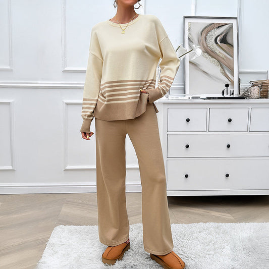Completo Donna Autunnale con Maglione a Righe e Pantaloni a Gamba Dritta con Motivo