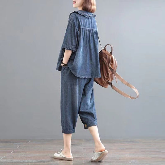 Completo Donna Autunno Ricamato Due Pezzi con Top a Vestibilità Larga e Maniche Volanti