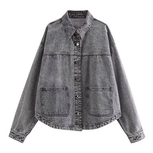 Giacca Donna in Denim Lavato con Maniche Lunghe e Vestibilità Ampia
