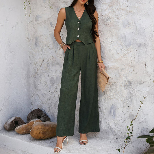 Completo Primaverile da Donna con Gilet e Pantaloni a Gamba Larga con Dettaglio Bottoni