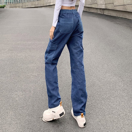 Pantaloni Donna a Vita Alta a Gamba Larga in Denim con Coulisse e Tasche Laterali Autunnali