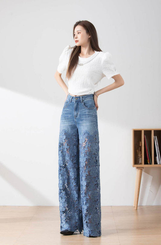 Pantaloni di Jeans a Gamba Larga a Vita Alta con Motivo Floreale Autunnale | Perfetti per la Stagione Autunnale