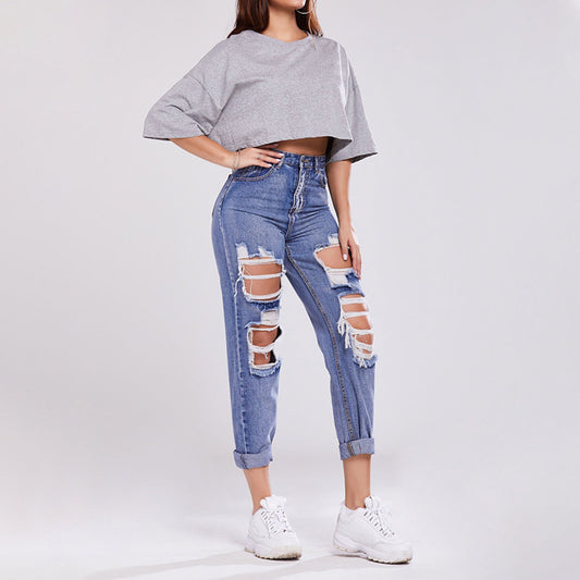Pantaloni Denim Donna Vita Alta Gamba Dritta Effetto Consumato E Design Modellante