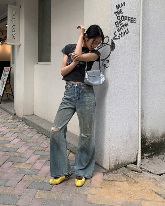 Jeans da Donna in Denim a Gamba Dritta con Strappi Stile Retrò