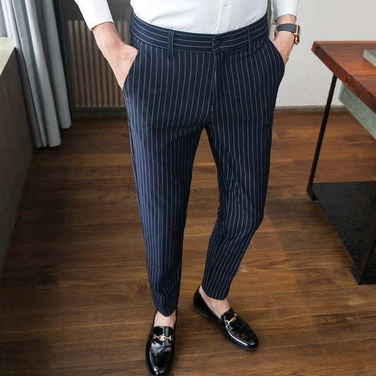Pantaloni Uomo Eleganti Slim Fit a Righe Dritti Vita Media Autunnali