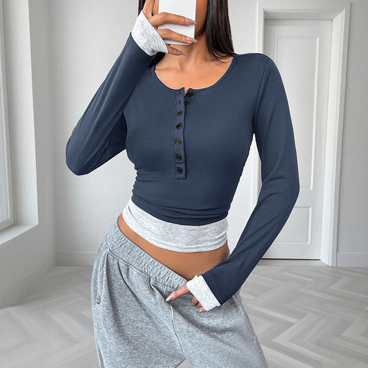 Top til kvinder med lange ærmer, slim fit, rund halsudskæring og falsk todelt design