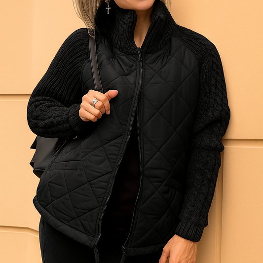 Dame Vinter Quiltet Jakke Med Strikkede Ærmer Og Høj Krave