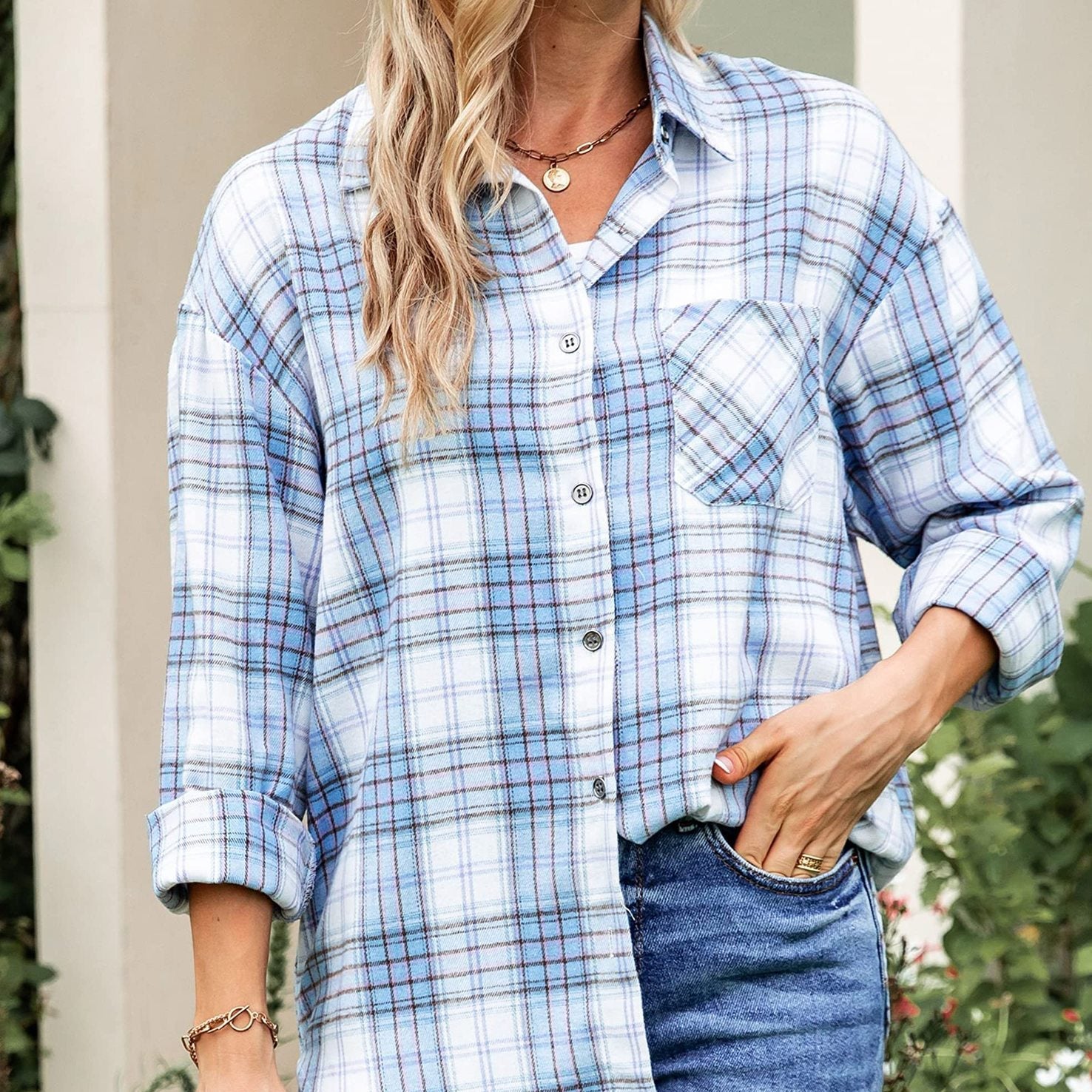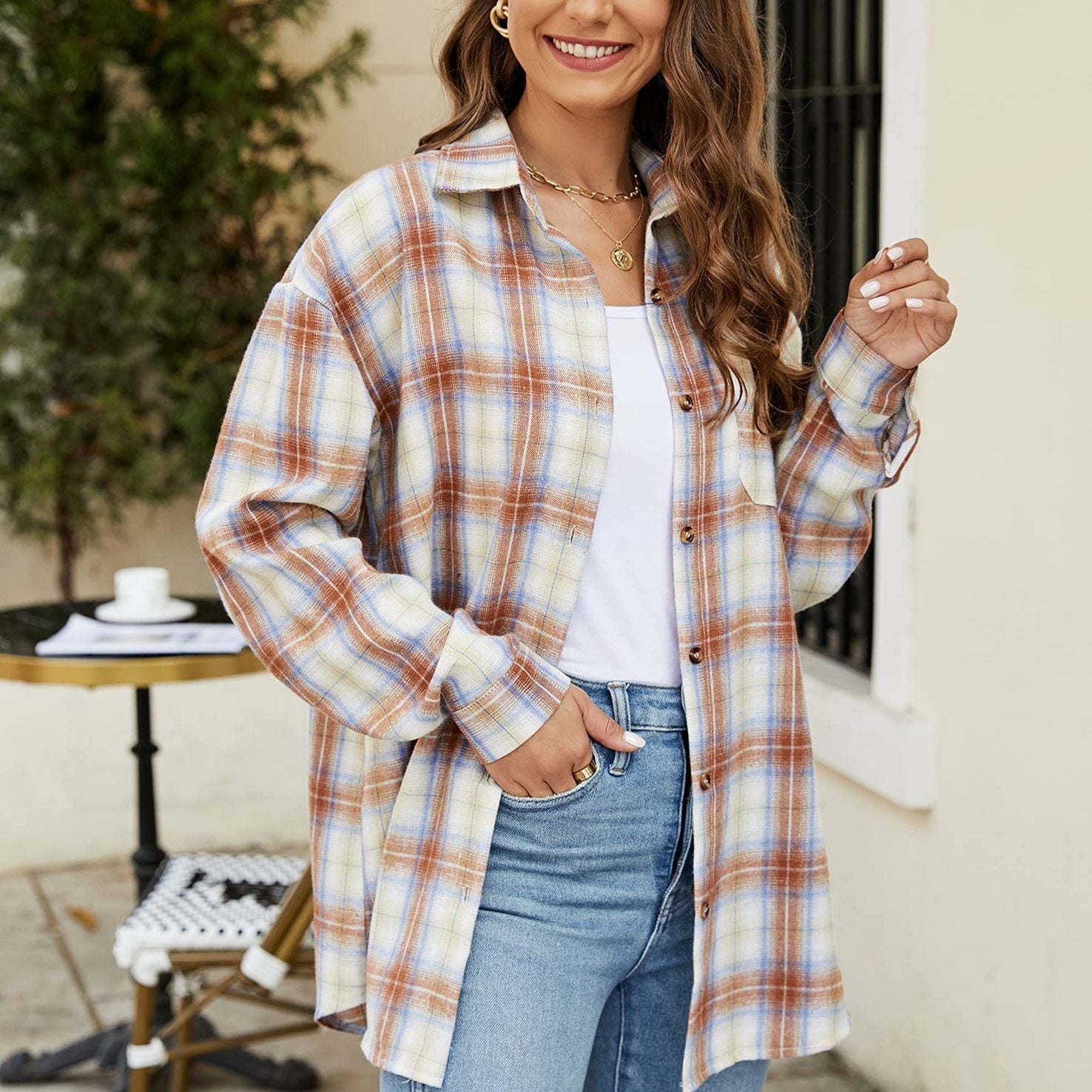 Denne dame-skjorte i mellemlang længde har et ternet mønster med en løs og afslappet pasform, lange ærmer og en traditionel knaplukning foran. Detaljen med den forreste lomme tilføjer funktionalitet og fremhæver det klassiske udtryk af tøjet. Fås i flere farver, kan den bæres alene eller lag-på-lag som en overshirt, hvilket gør den til et alsidigt supplement til hverdagsgarderoben.