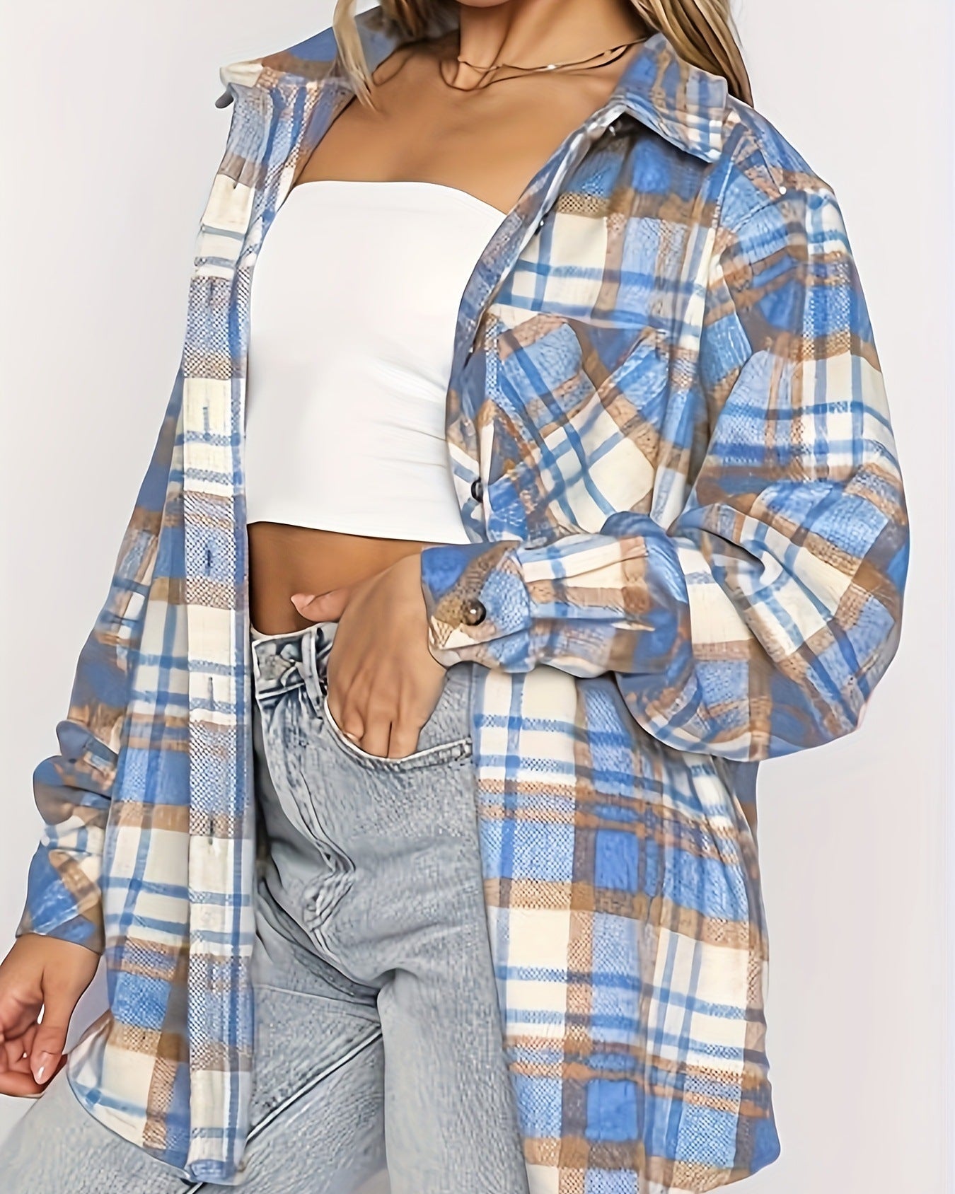 Dame Skjorte med Lange Ærmer i Ternet Mønster med Manchetknapdetalje og Prinsesseærmer