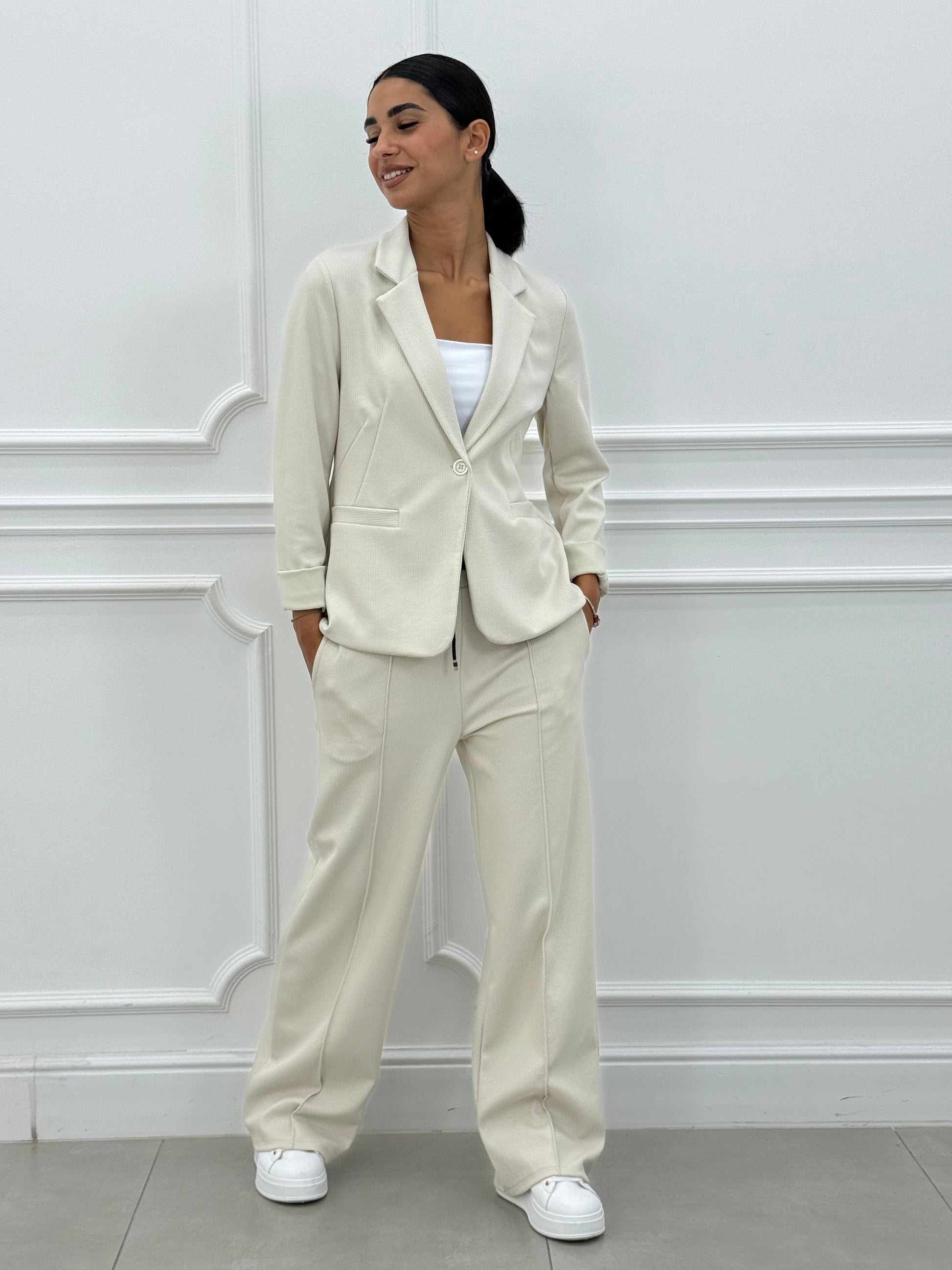 • Koordineret sæt: blazer og bukser lavet i samme farve for en ensartet stil