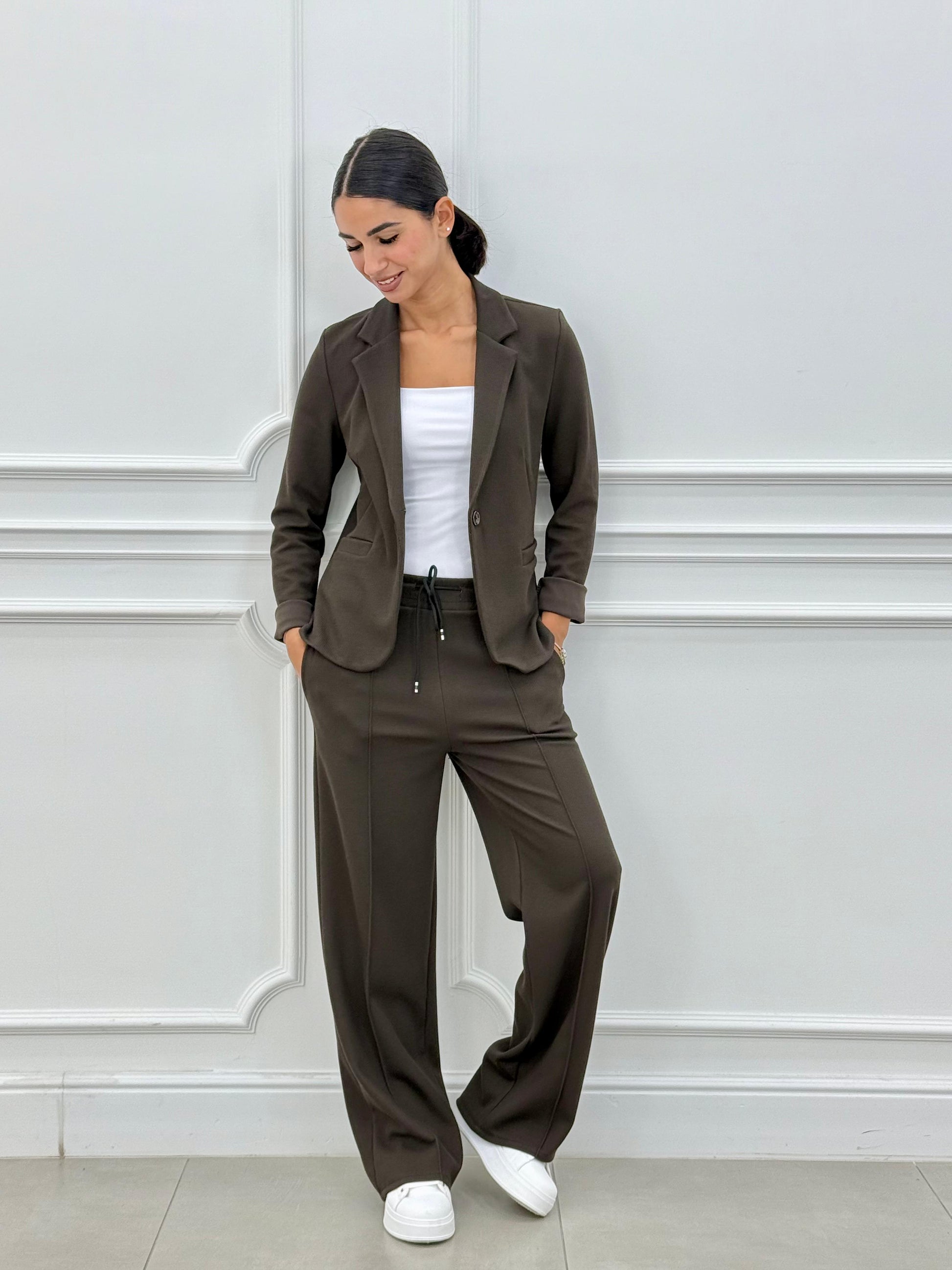 Dette to-delte sæt inkluderer en blazer og lange bukser designet til et koordineret look. Begge dele har samme farve og materiale, hvilket sikrer et ensartet udseende. Bukserne har elastik i taljen med justerbar snøre for en personlig pasform. Det enkle design uden pynt gør det velegnet til forskellige daglige lejligheder.