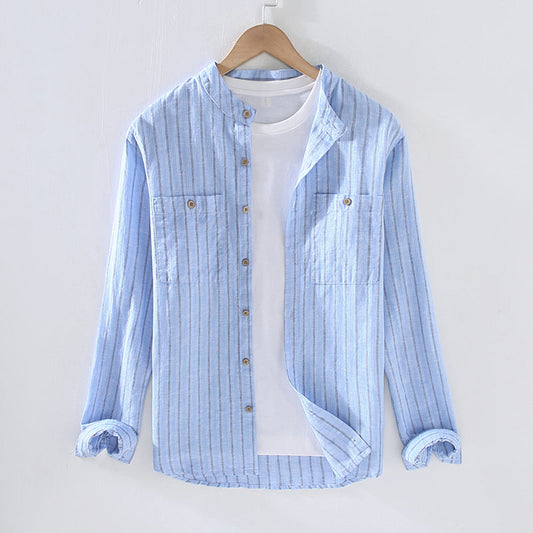 Blusa de mujer de manga larga con cuello coreano y dobles bolsillos a rayas