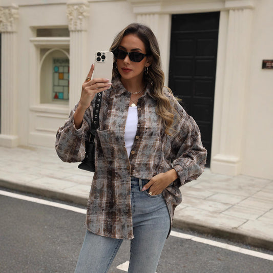 Camisa de mujer de manga larga a cuadros con detalle rasgado y bolsillo frontal