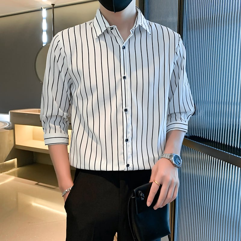 Esta camisa de hombre de manga larga presenta un cuello cuadrado y un motivo de rayas, diseñada para un entorno urbano contemporáneo. El ajuste ofrece una línea estructurada pero relajada, adecuada para el uso diario y ocasiones semi-formales. Las diferentes variantes de rayas permiten combinaciones versátiles con varios tipos de pantalones.