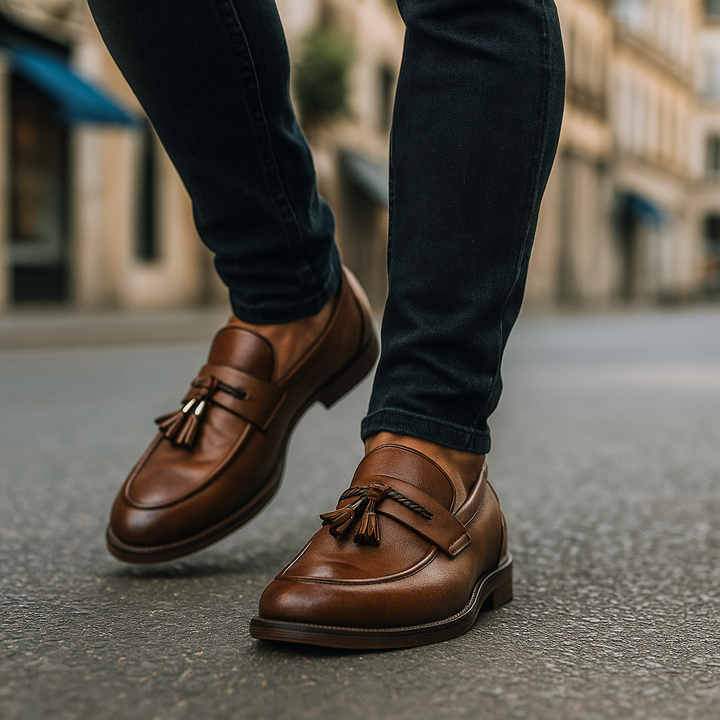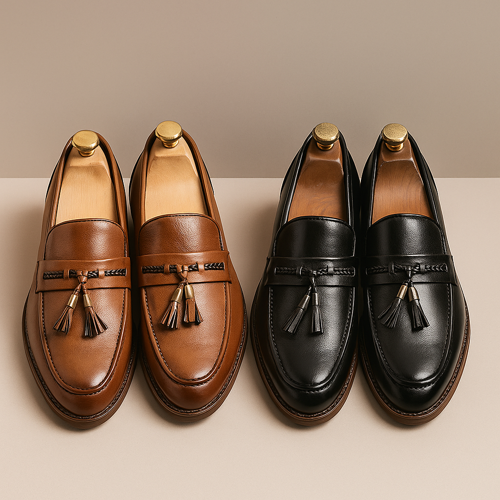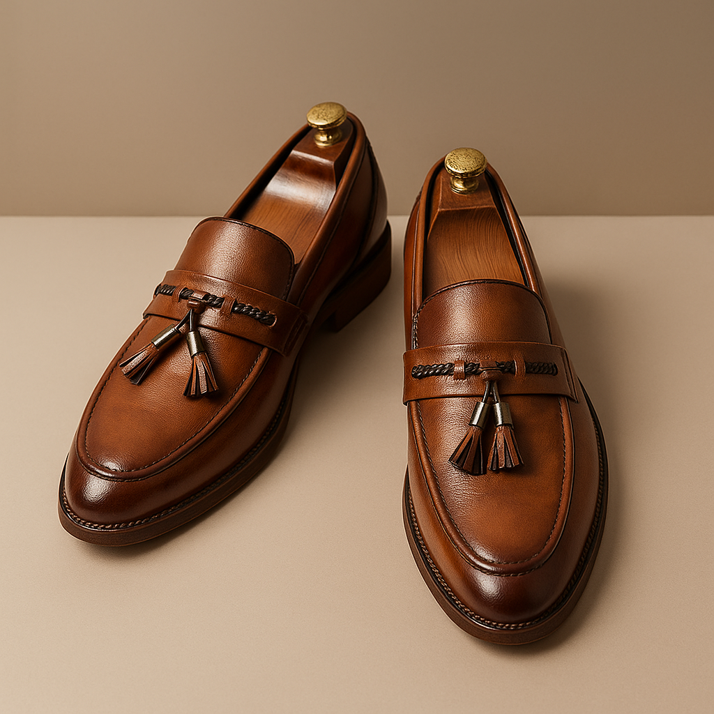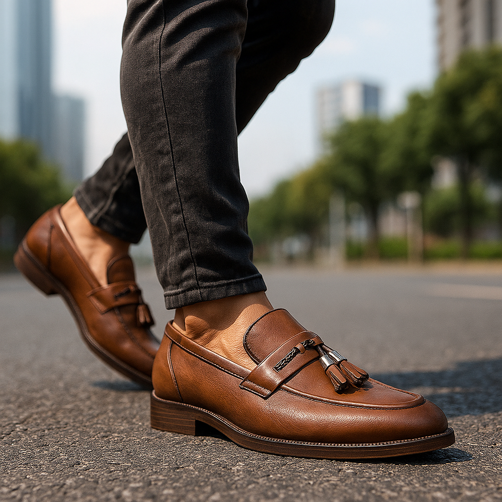 Questi mocassini da uomo presentano una tomaia lucidata con fascia intrecciata e doppie nappine disposte sulla parte superiore. La soletta è imbottita per garantire comfort durante l’uso quotidiano, mentre la suola cucita e il tacco basso a strati offrono una base strutturata adatta a contesti quotidiani e semi-formali. La calzata slip-on rende il design pratico, mantenendo una silhouette pulita senza dettagli superflui.